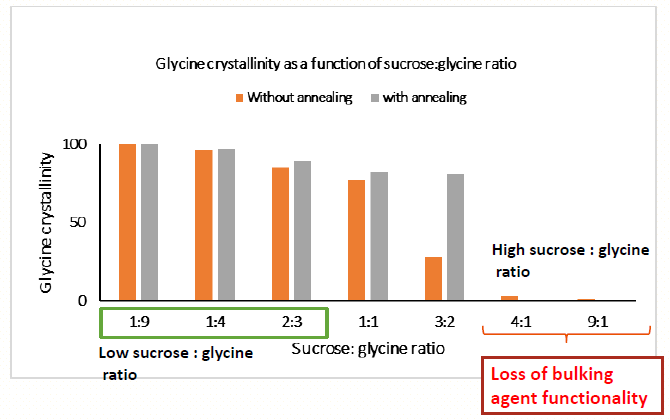 實驗通過將蔗糖和甘氨酸以不同比例(從1:9到9:1)溶解于水中,分別在15℃退火1h 和不進行退火,凍干后樣品通過近紅外光譜測定甘氨酸的結(jié)晶度。觀察到當(dāng)蔗糖:甘氨酸>4時,甘氨酸失去了其填充劑的功能(Bai et al., J Pharm. Sci. 2004)。